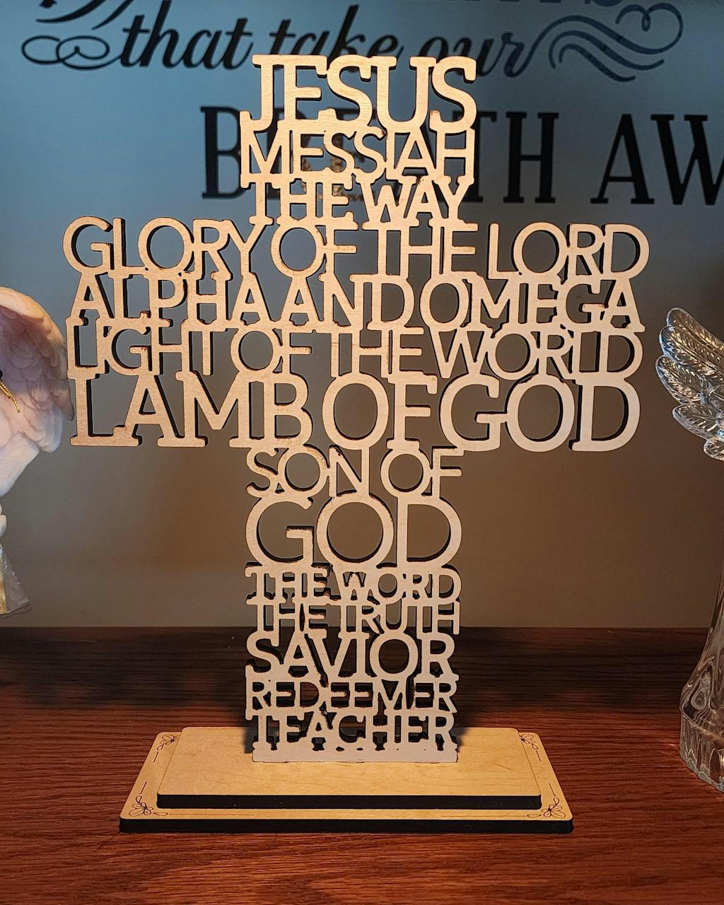 Vector files for laser cutting cross with some of the different names Jesus is called on the Bible. Christian or Catholic decor for home, church, community centers and more. Perfect for Easter. Great design for religious events like baptism (christening), first communion or confirmation; as centerpiece, decor, favor (bomboniere) or gift.