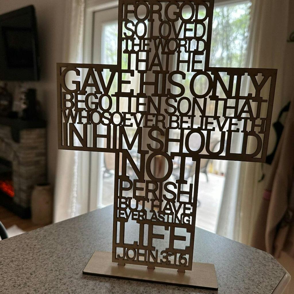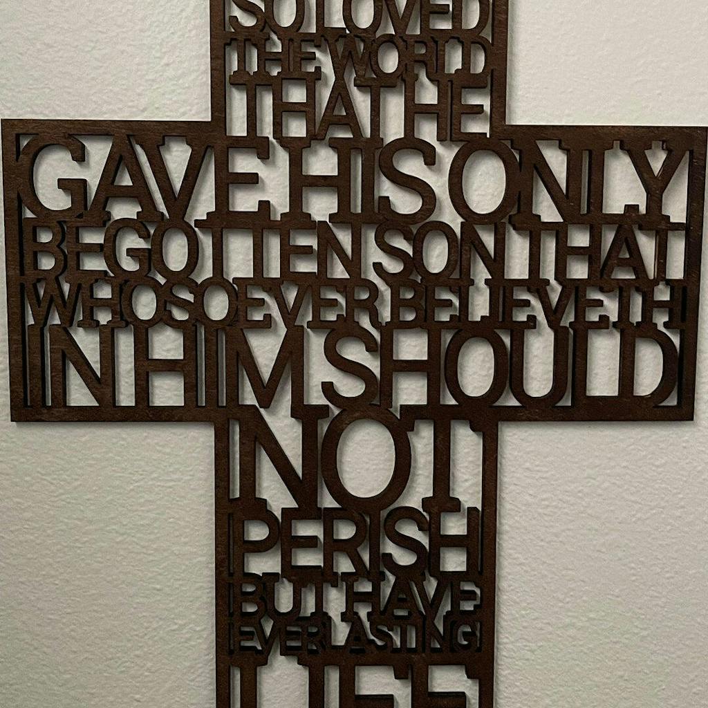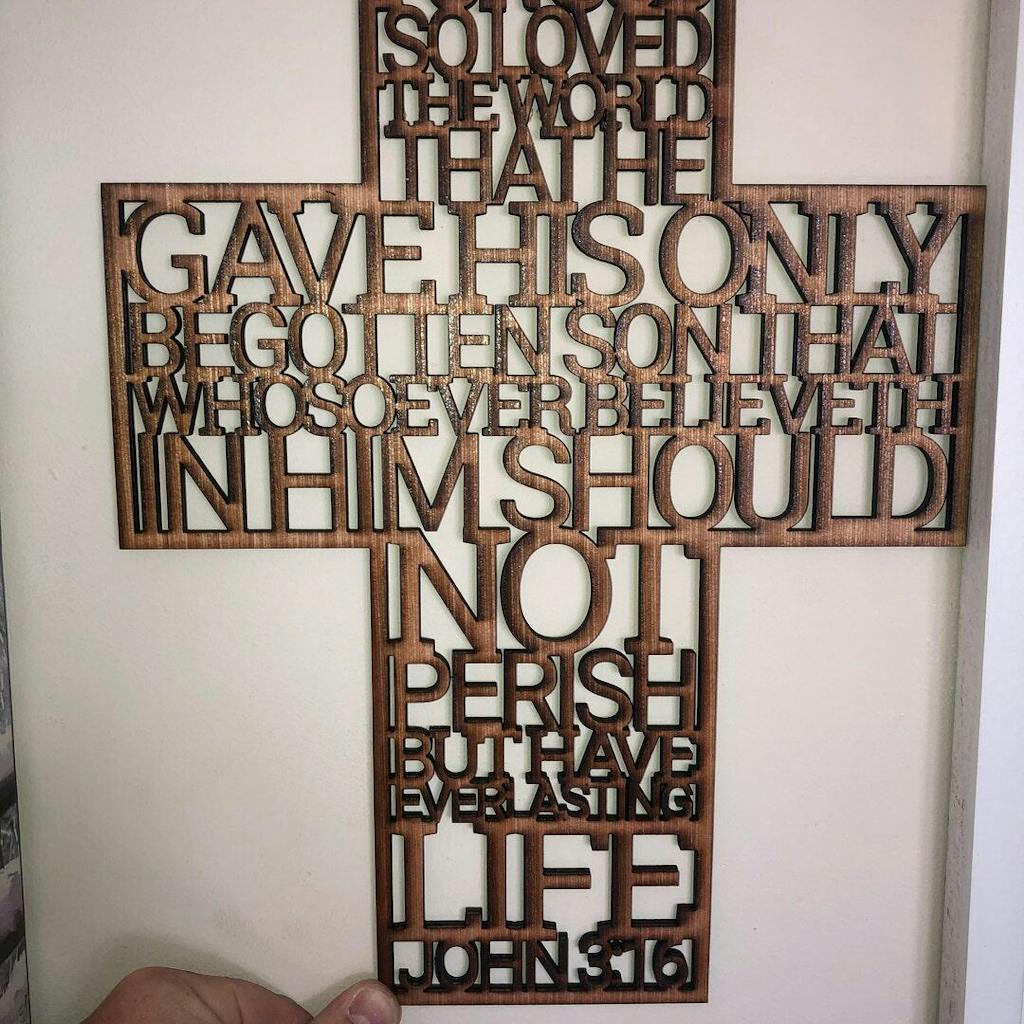 Vector files for laser cutting cross with text from John 3:16. Christian or Catholic decor for home, church, community centers and more. Great design for religious events like baptism (christening), first communion or confirmation; as centerpiece, decor, favor (bomboniere) or gift.