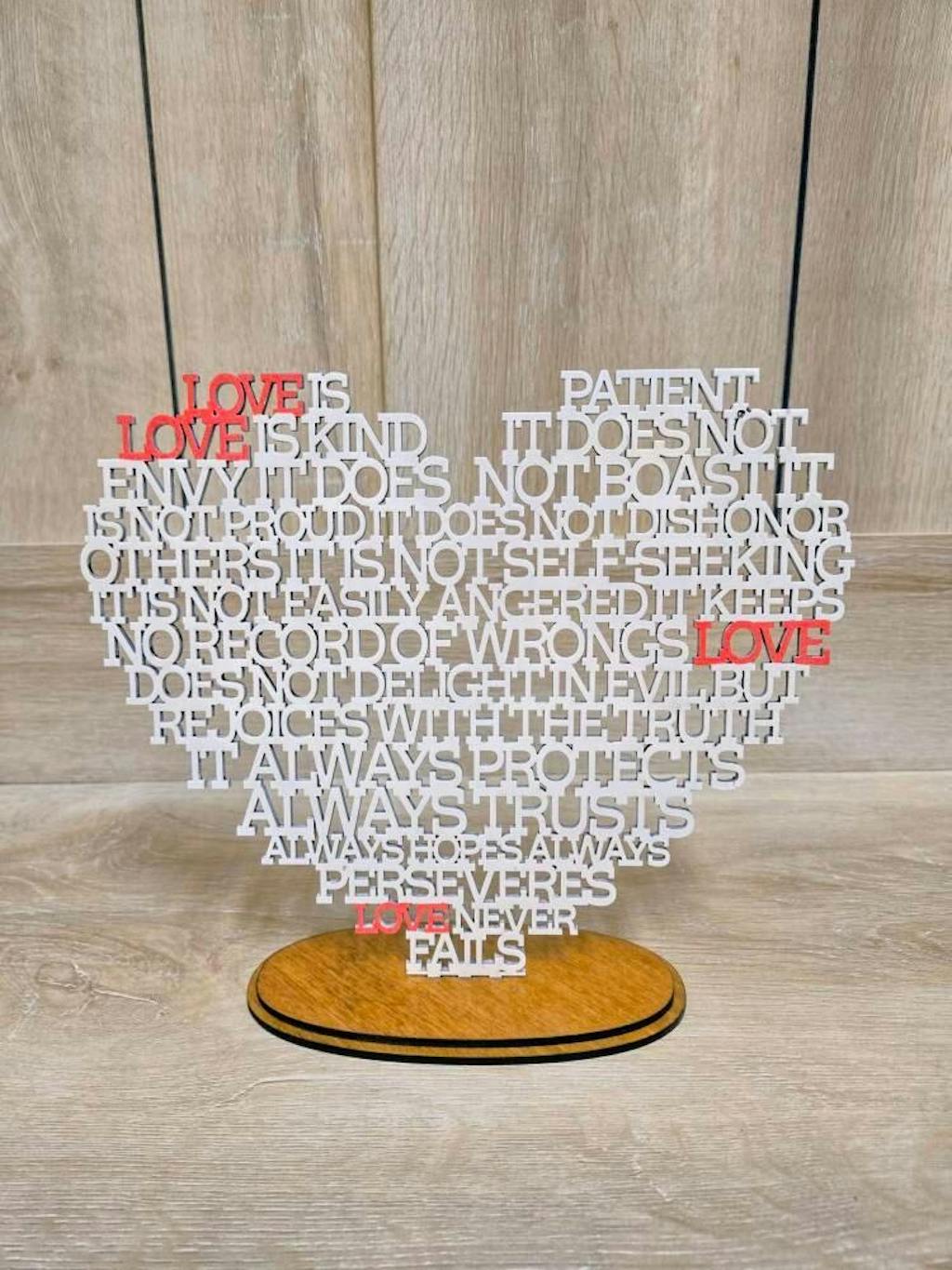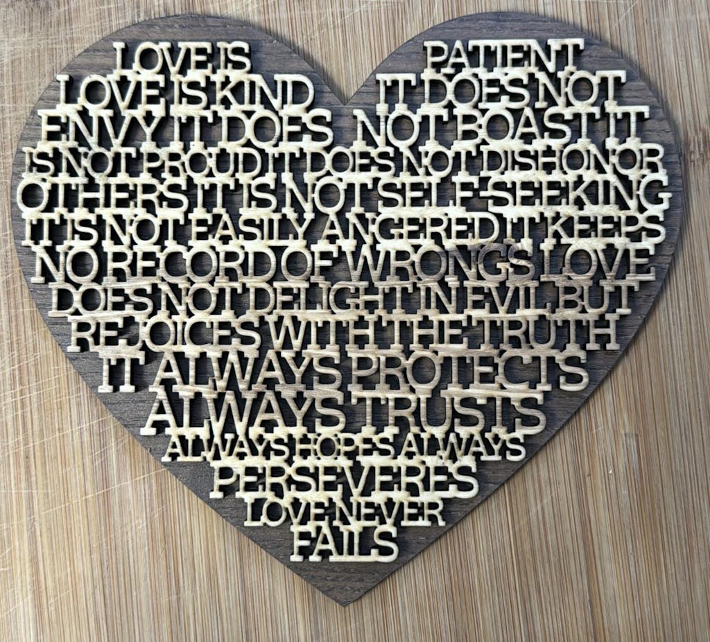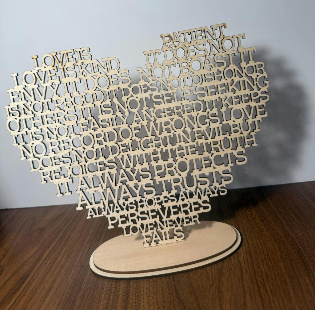 Vector files for laser cutting heart with text from Corinthians 13:4. Christian or Catholic decor for home, community centers and more. Great design for religious events like baptism (christening), first communion or confirmation; as centerpiece, decor, favor (bomboniere) or gift. Excellent gift or decor for wedding or anniversary. Also good for Valentines day.