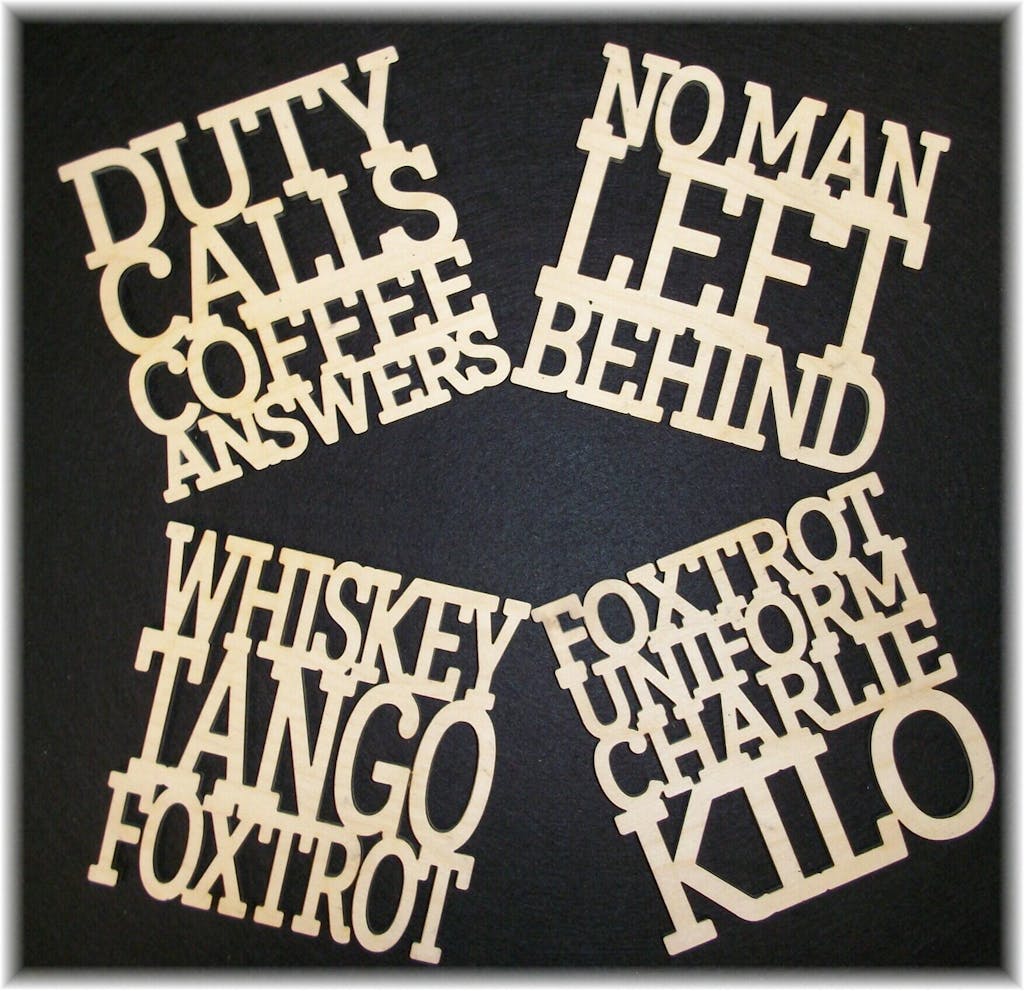 Digital vector files for laser cutting ten different drink coasters with military themed texts. Every coaster is 10x10cm (4x4in).