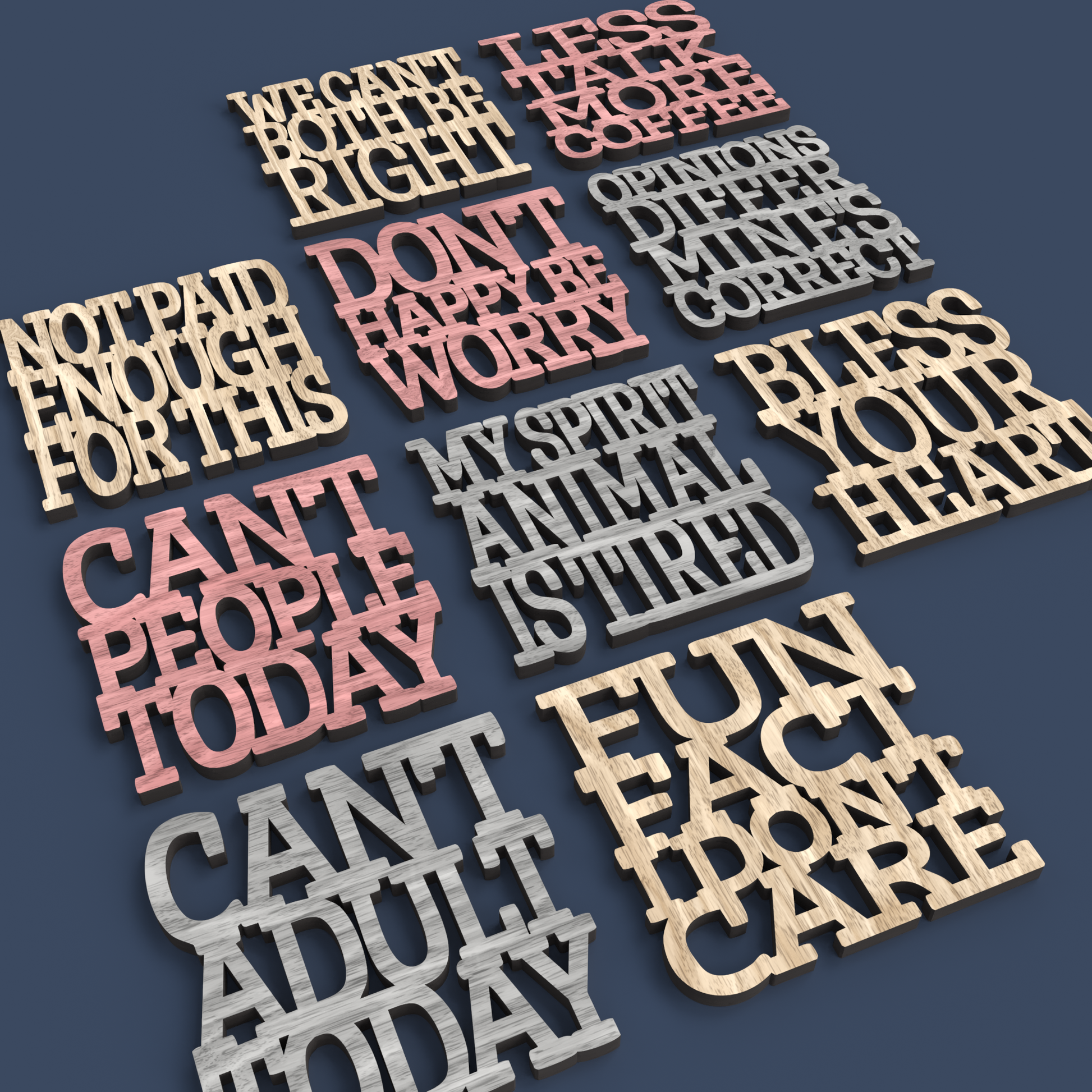 Digital vector files for laser cutting ten different drink coasters with funny sarcastic quotes. Every coasters is 10x10cm (4x4in).