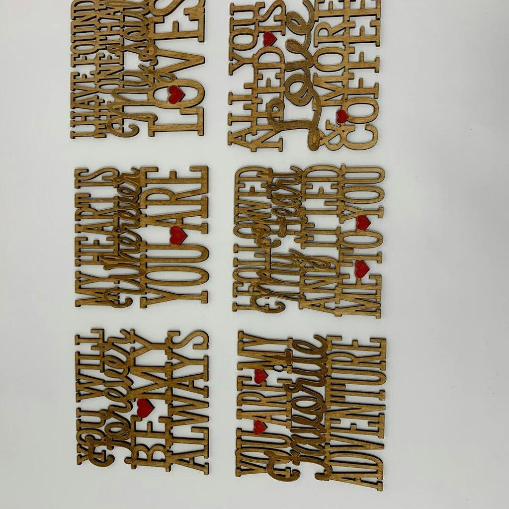 Vector files for laser cutting six different coasters with romantic quotes.